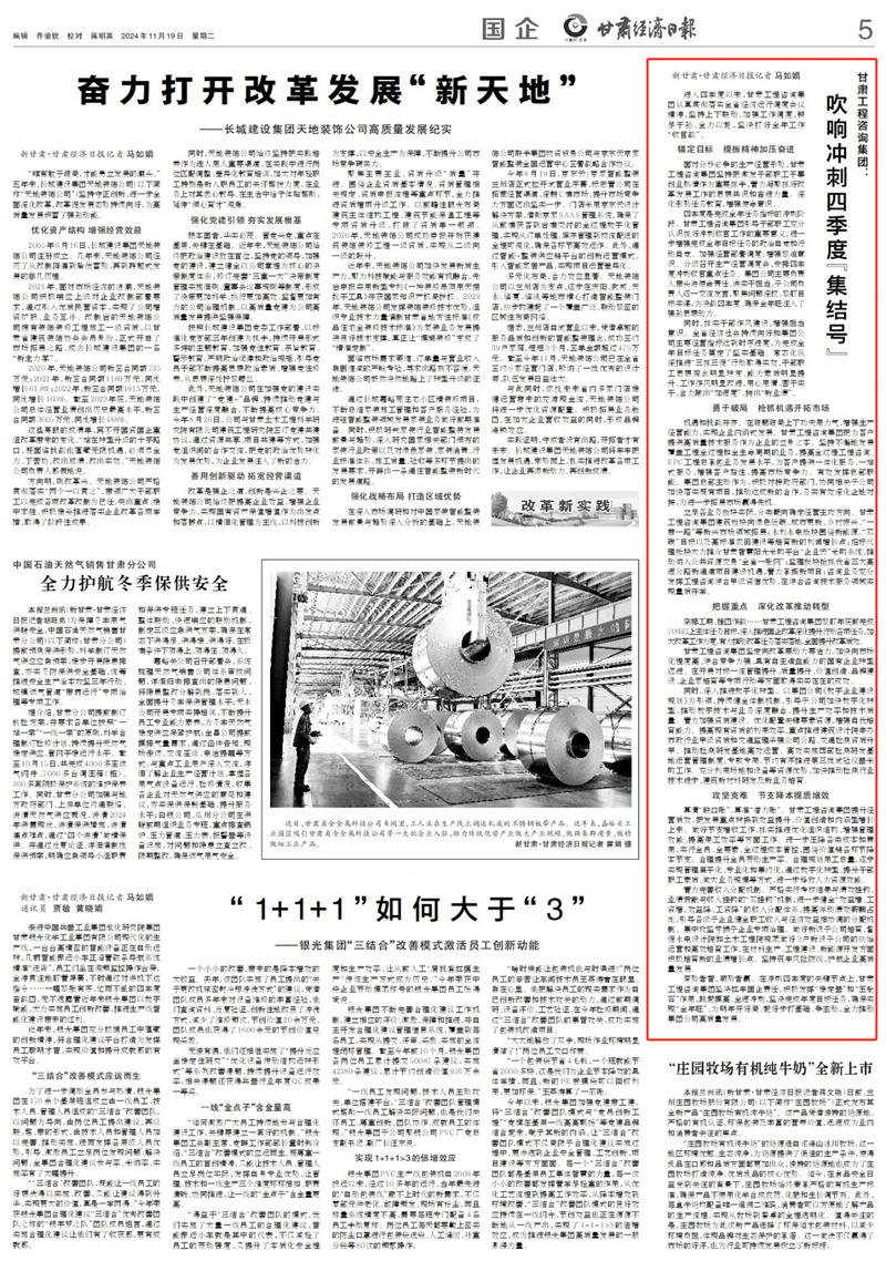 倒排工期、掛圖作戰(zhàn)……甘肅工程咨詢集團(tuán)緊盯年底前完成70%以上主體任務(wù)目標(biāo),深入推進(jìn)國企改革深化提升行動各項任務(wù),加大改革工作力度,有力推動改革任務(wù)落實落地,全面提升改革質(zhì)效。