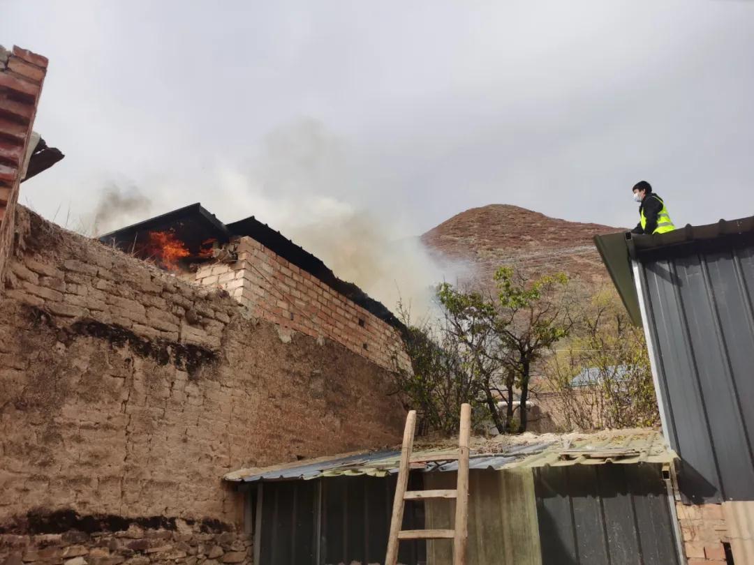10月30日下午3點,交通監(jiān)理公司負(fù)責(zé)幫扶的臨潭縣洮濱鎮(zhèn)馬旦溝村一戶村民家中突然冒出滾滾濃煙,火光在濃煙中忽隱忽現(xiàn)。著火是一座磚木結(jié)構(gòu)彩鋼屋頂?shù)男路?,火從屋頂燒起,越燒越旺。著火的房屋旁邊堆放著多年的老柴火,干燥異常,一絲火星就能點燃,而與著火點緊鄰著的就是布局緊密的鄉(xiāng)親們的房屋,再往外圍則緊接著山林,如果火勢蔓延,后果將不堪設(shè)想。